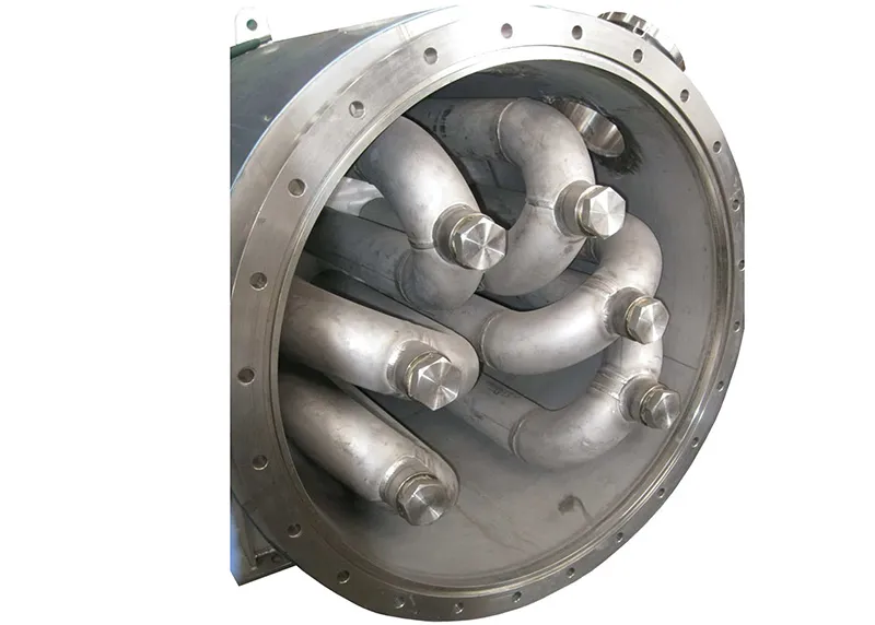 The Stord Tube Pre-Heater is a shell-and-tube heat exchanger installed upstream of the screw cooker. It uses waste heat recovered from the drying process — specifically, hot vapour from the disc dryer — to pre-heat raw fish material to 45–50°C before it enters the cooker. The result is a dramatic reduction in the energy demand of the cooker, typically around 50%, along with a reduction in the required retention time.
