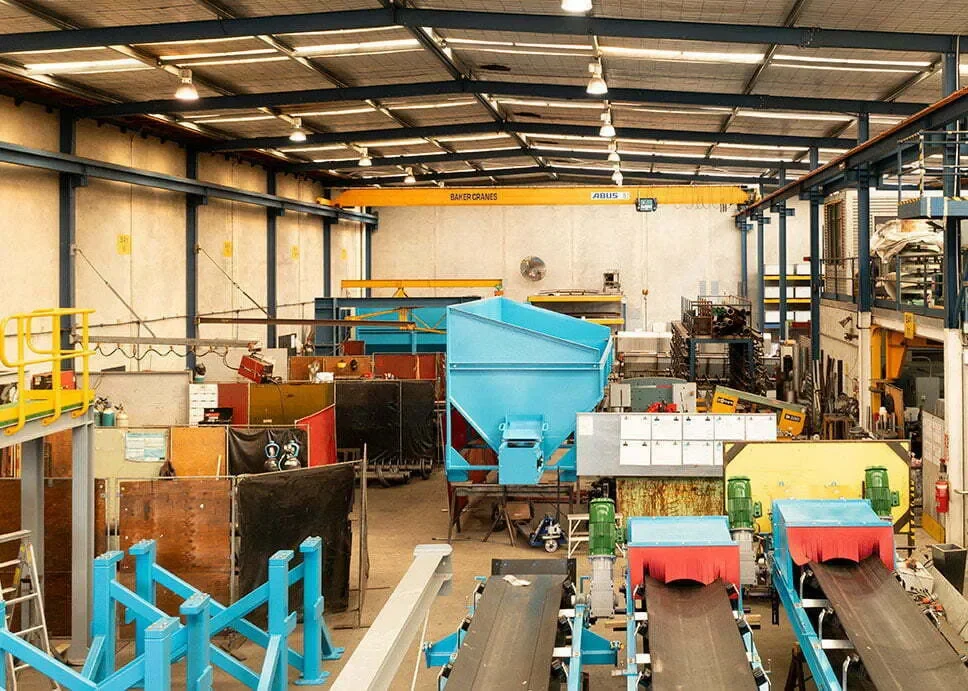 Our workshop allows us to manufacture custom-built machinery. With a 1150 m2 floor area and two overhead gantry cranes, we can carry out large, multiple projects. Our workshop includes a CNC teach lathe, a turret mill, a large guillotine, and specialised equipment for fabricating conveying systems. Many in our workshop team have been with us for over a decade, bringing maturity and valuable fabrication experience.